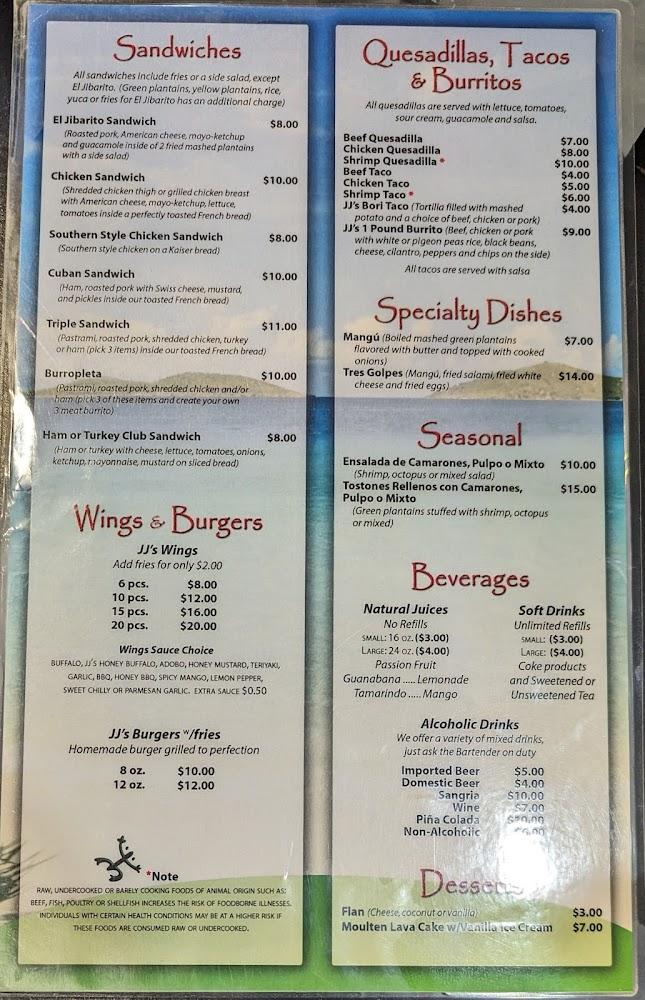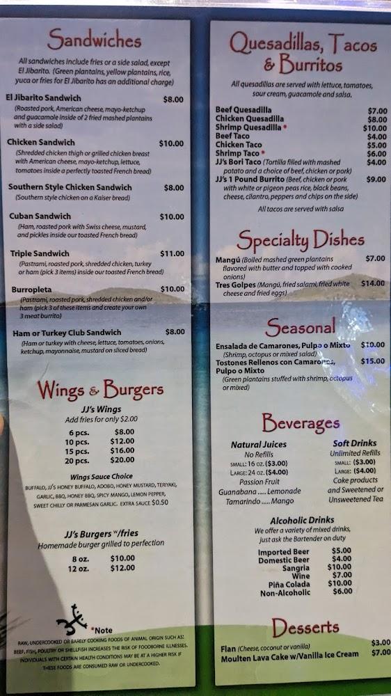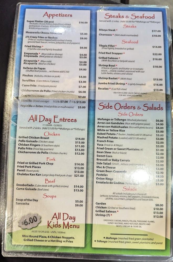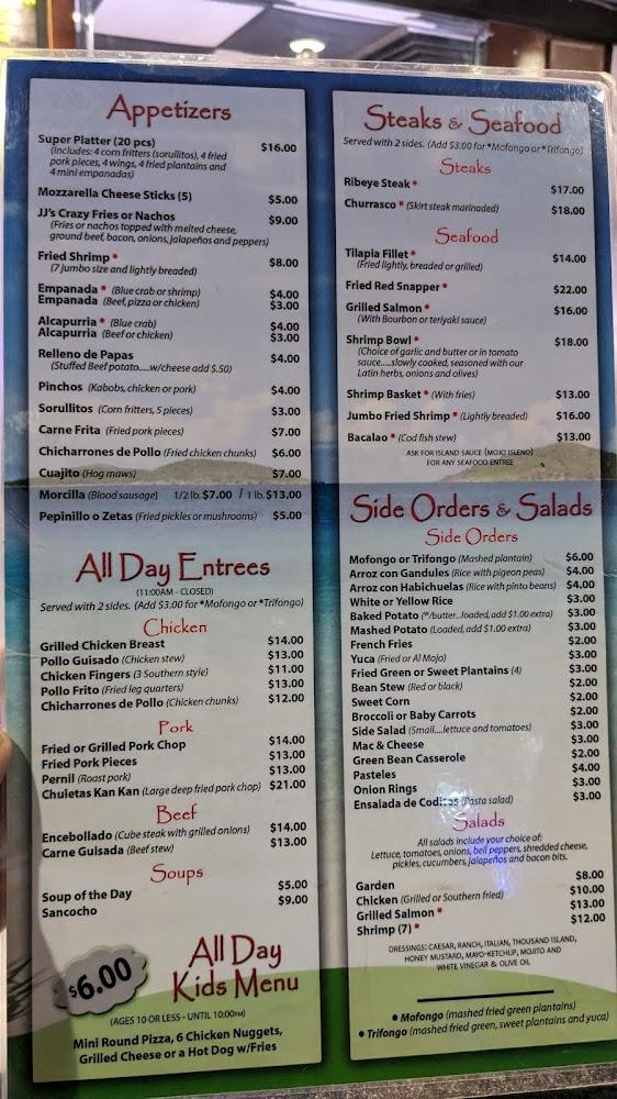 JJ's Bar & Grill offers a rich menu with a variety of dishes. From flavorful burgers to hearty salads, there's something for everyone. The seafood menu shines with options like Fried Red Snapper and Grilled Salmon. The sides, including Mofongo and Trifongo, are local highlights.